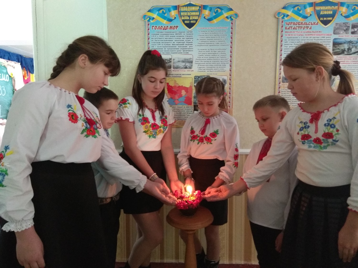 «Неврожай від Бога, а голод від людей», трактує одне українське прислів`я. Саме з цих слів і кліпу з піснею «Свіча» Оксани Білозір розпочався захід, в якому прийняли участь працівники школи та учні 6-10 класів. Учні виступили і в ролі істориків, і в ролі поетів, і глядачів. Бо було переглянуто декілька кліпів: «Молитва 33 року», «Остання молитва хлопчика», «Колискова 33-го року», «Реквієм мільйонів знищених голодом», «І крізь століття пронесіть сльозу невинно убієнних», «Господи, помилуй нас». Разом з учнями була створена і переглянута презентація «Голодомор 1932-1933 років геноцид українського народу». Всі присутні вшанували пам`ять загиблих хвилиною мовчання та запаленням свічки, яка освітила своїм яскравим полум`ям зерно пшениці і окраєць хліба, і колоски пшениці – 5 колосків.